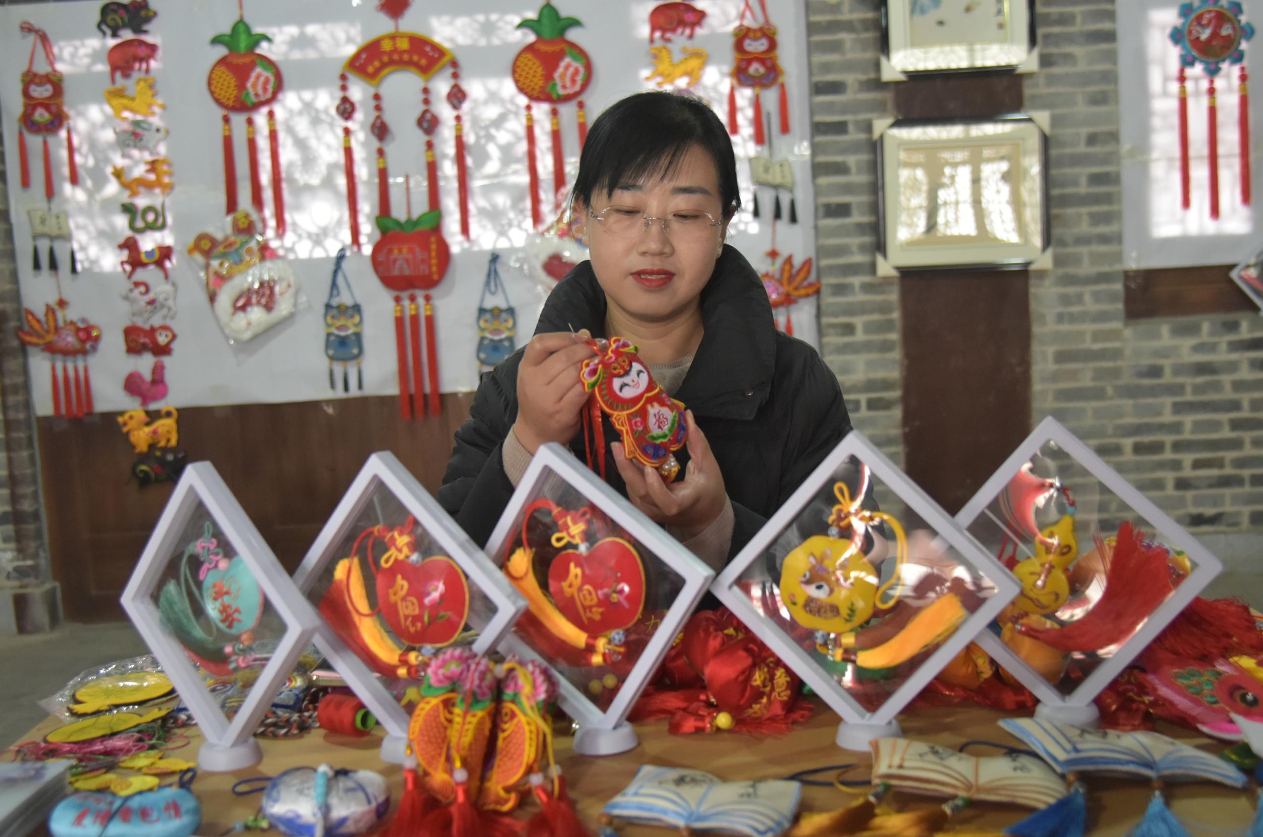 除了剪紙,鎮(zhèn)原縣香包、刺繡、書法等傳統(tǒng)文化藝術(shù)氛圍也很濃厚,深受廣大群眾喜愛。在文化一條街,十幾家書畫、香包、刺繡工作室緊挨,組成了一條文化長(zhǎng)廊,除了銷售文創(chuàng)產(chǎn)品外,還承擔(dān)著非遺文化傳承和技藝培訓(xùn),熱鬧而又成氣候。“作為一名非遺傳承人,不僅要把自己的香包刺繡產(chǎn)品設(shè)計(jì)好、做精致,更重要的是要把這門技藝教給更多的人,讓香包、刺繡這門技藝更好地傳承下去。”慶陽(yáng)香包刺繡非物質(zhì)文化遺產(chǎn)傳承人任艷艷說,自己在文化一條街已經(jīng)開店近十年了,帶出了很多巧媳婦巧婆婆,還不時(shí)受邀在縣內(nèi)外進(jìn)行培訓(xùn)指導(dǎo)。