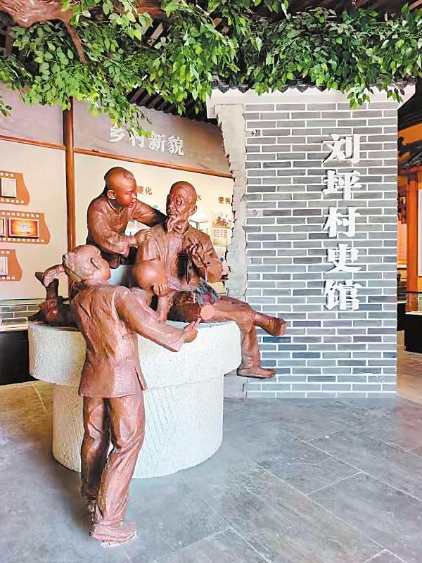 年復(fù)一年的寒來(lái)暑往中,大榆樹,也就成了劉坪村的望鄉(xiāng)臺(tái)。每個(gè)村莊,都有它的望鄉(xiāng)臺(tái),它承載著人們共同的記憶,是人們重溫鄉(xiāng)愁的地標(biāo),永遠(yuǎn)鐫刻在人們的心底。2000年,電視劇《黃沙下面是沃土》的劇組來(lái)到劉坪村拍攝取景,村里的望鄉(xiāng)臺(tái)大榆樹被拍進(jìn)電視劇畫面。在劉坪村村史館布設(shè)中,專家和學(xué)者數(shù)易村史館方案,最終確定在村史館正門之內(nèi)塑造一組雕塑,意思是由一位老人講述劉坪村的村史,作為村史館的題眼,村史館內(nèi)還陳列了《劉坪村志》,分為建置、地理、村落文化、風(fēng)土人情等14卷,共40萬(wàn)字。館內(nèi)能播放劉坪村村史專題片《耕讀傳家》。