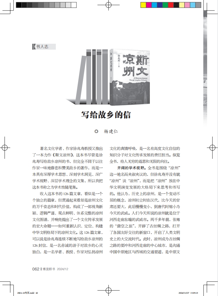 閱讀徐兆壽寫(xiě)給故鄉(xiāng)的帶著滾燙體溫的126封信,總是給人一種澎湃的激情和磅礴的力量,總是讓人思接千載、視通萬(wàn)里?!端刮臎鲋荨妨⒆憬z綢之路和中華文明的歷史格局,提出了重構(gòu)涼州文化的宏大愿望,讓讀者深刻認(rèn)識(shí)到,徐兆壽的故鄉(xiāng)涼州,不單單是他日夜眷戀的熱土,而是打破了行政區(qū)劃的大地理概念,更是中華民族共同的文化符號(hào)和精神歸宿。在建設(shè)中華民族現(xiàn)代文明的今天,我們應(yīng)當(dāng)全面了解、認(rèn)識(shí)、重構(gòu)涼州文化,真正做到創(chuàng)造性轉(zhuǎn)化、創(chuàng)新性發(fā)展。認(rèn)識(shí)了這本書(shū)的價(jià)值,也就認(rèn)識(shí)了作者的價(jià)值,徐兆壽不僅是一位優(yōu)秀的文化學(xué)者、教授、作家,而且也是一位有智慧、有見(jiàn)地的歷史學(xué)家。