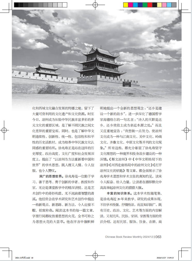 開(kāi)闊的學(xué)術(shù)視野。全書(shū)是圍繞“涼州”這一地名而夾敘夾議的,但徐兆壽并沒(méi)有就“涼州”談“涼州”,而是把“涼州”放在中華文明演變發(fā)展的大格局下來(lái)思考和書(shū)寫(xiě)的。他認(rèn)為,歷史上的涼州,是一個(gè)變動(dòng)不居的概念,涼州初立時(shí)在漢代,比今天的甘肅還要大,此后慢慢變小,到唐代時(shí)縮小為今天的武威。人們今天所說(shuō)的涼州就是位于河西走廊東端的武威市。兩千多年前,張騫的“鑿空之旅”,開(kāi)辟了古絲綢之路,打開(kāi)了各國(guó)友好交往的新窗口,開(kāi)啟了人類(lèi)文明史上的大交流時(shí)代。此時(shí),涼州成為古絲綢之路的要沖和河西走廊的中心城市,是溝通中國(guó)中原地區(qū)與西域的交通要道,是中原文化和西域文化融合發(fā)展的傳播之地,留下了大量可資利用的文化遺產(chǎn)和文化資源。時(shí)至今日,涼州成為體驗(yàn)中華民族豐富多彩的多元文化的重要區(qū)域,是了解不同民族之間文化差異的重要寶庫(kù),同時(shí),也是了解中華文明連續(xù)性、創(chuàng)新性、統(tǒng)一性、包容性和和平性的歷史活教材,成為培養(yǎng)中華民族文化認(rèn)同感的重要場(chǎng)所。徐兆壽正是站在這樣的歷史厚度、政治高度、文化廣度和社會(huì)發(fā)展深度上,提出了“以涼州為方法重新看中國(guó)和世界”的學(xué)術(shù)思想,既入理又入情,令人信服,也令人贊嘆。