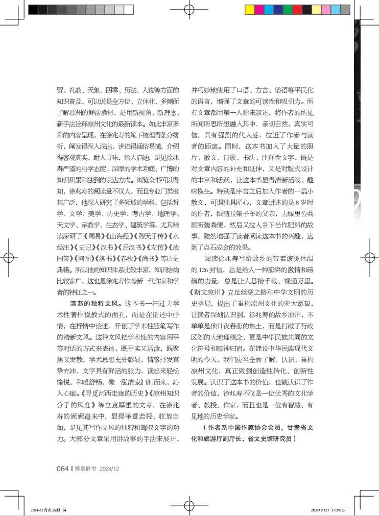 豐富的知識(shí)體系。這本學(xué)術(shù)性隨筆集,是徐兆壽近20年來(lái)教學(xué)、研究的成果體現(xiàn),不但學(xué)術(shù)性強(qiáng)、抒情性濃,而且知識(shí)面廣,既有歷史、政治、文化、藝術(shù)等方面的內(nèi)容解讀,又有民風(fēng)、民俗、家訓(xùn)、家教等方面的常識(shí)介紹,還有民居、服飾、飲食、農(nóng)耕、商貿(mào)、禮教、天象、四季、歷法、人物等方面的知識(shí)普及,可以說(shuō)是全方位、立體化、多側(cè)面了解涼州的鮮活教材,是用新視角、新理念、新手法詮釋涼州文化的最新讀本。如此豐富多彩的內(nèi)容呈現(xiàn),在徐兆壽的筆下梳理得條分縷析,闡發(fā)得深入淺出,講述得通俗易懂,介紹得客觀真實(shí),耐人尋味,給人啟迪,足見(jiàn)徐兆壽嚴(yán)謹(jǐn)?shù)闹螌W(xué)態(tài)度、深厚的學(xué)術(shù)功底、廣博的知識(shí)積累和獨(dú)到的表達(dá)方式。瀏覽全書(shū)可以得知,徐兆壽的閱讀量不僅大,而且專(zhuān)業(yè)門(mén)類(lèi)極其廣泛,他深入研究了多領(lǐng)域的學(xué)科,包括哲學(xué)、文學(xué)、美學(xué)、歷史學(xué)、考古學(xué)、地理學(xué)、天文學(xué)、宗教學(xué)、生態(tài)學(xué)、建筑學(xué)等,尤其精讀深研了《周易》《山海經(jīng)》《穆天子傳》《水經(jīng)注》《史記》《漢書(shū)》《后漢書(shū)》《左傳》《戰(zhàn)國(guó)策》《河圖》《洛書(shū)》《春秋》《尚書(shū)》等歷史典籍。所以他的知識(shí)體系比較豐富,知識(shí)結(jié)構(gòu)比較寬廣,這也是徐兆壽作為新一代作家和學(xué)者的特征之一。