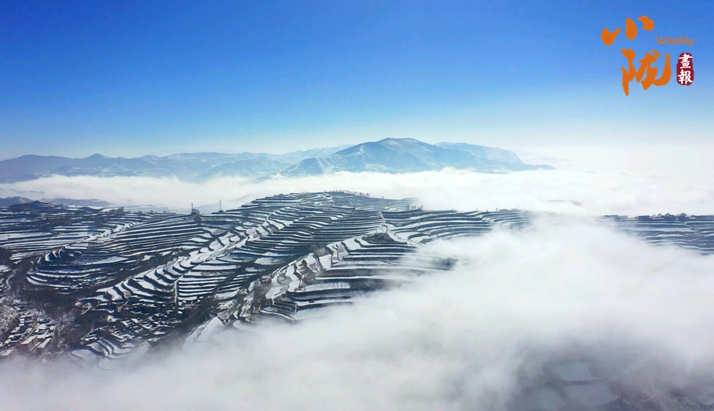 溝壑縱橫的山谷和層層梯田云霧繚繞,俯視而下,山川與云海交織如水墨畫。