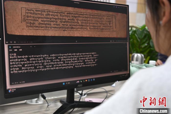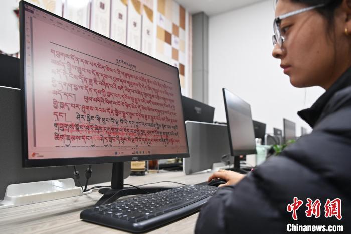 2月27日,在甘肅甘南藏族自治州碌曲縣益西達吉科技有限公司內(nèi),工作人員正在進行藏文古籍數(shù)字化相關工作。該公司主要從事民族古籍數(shù)字化建設和古籍文獻數(shù)據(jù)庫建設,自2019年以來,承擔西藏、四川、甘肅等省區(qū)的藏文古籍數(shù)字化項目。圖為工作人員用該公司研發(fā)的藏文信息處理系統(tǒng)對古籍數(shù)字化內(nèi)容進行檢查。中新社記者 九美旦增 攝