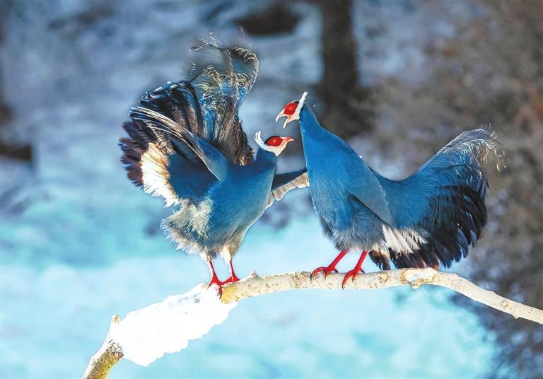 藍(lán)馬雞是珍稀名貴的禽類,頭側(cè)緋紅,耳羽簇白色、突出于頸部頂上,通體藍(lán)灰色,中央尾羽特長而翹起,尾羽披散下垂如馬尾,故名藍(lán)馬雞。冬日里,藍(lán)馬雞成群飛落山腳覓食,藍(lán)羽丹頂行走在雪地上格外搶眼。數(shù)量繁多的藍(lán)馬雞是祁連山野生山地雞的“顏值擔(dān)當(dāng)”。覓食時,藍(lán)馬雞常用爪刨挖林中空地苔蘚和林緣草地,尋找掉落的云杉種子。刨食的過程會讓土壤松動,便于種子生根發(fā)芽,促進(jìn)林區(qū)植物天然更新。