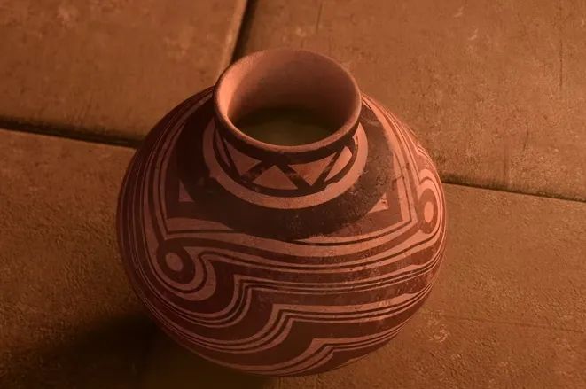 聚落西側(cè),陶窯青煙繚繞。匠人屈膝修整泥胎,赤鐵礦研成的褐彩順陶罐流瀉,旋渦紋隨轉(zhuǎn)盤(pán)飛旋延展。孩童赤足追逐,泥塑鳥(niǎo)獸滾落草間,驚散啄食的雞雛。