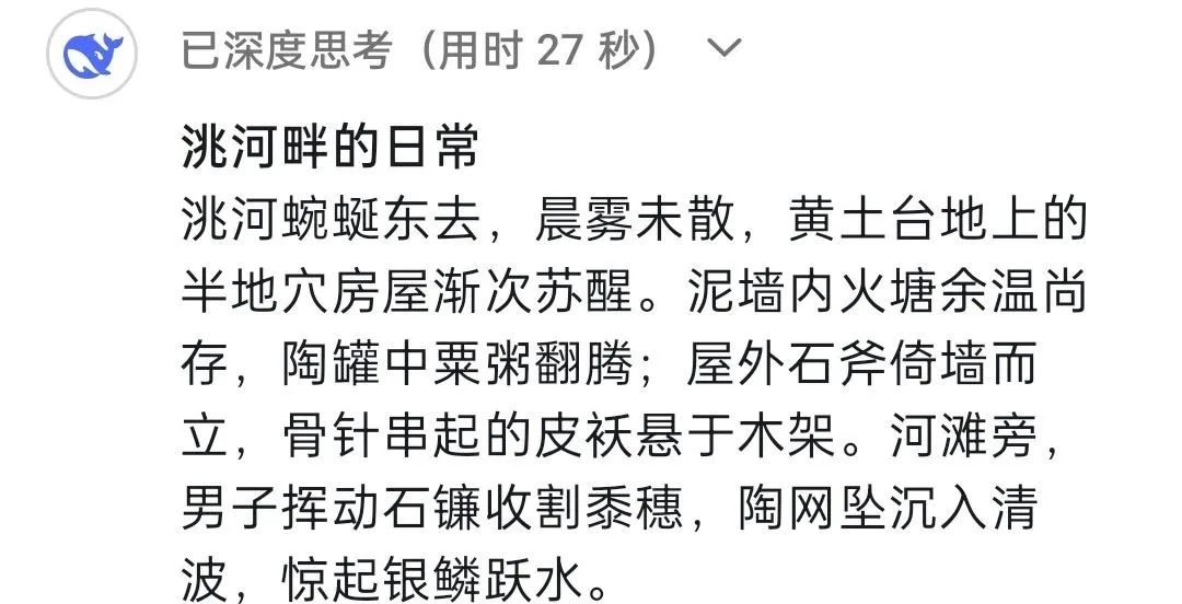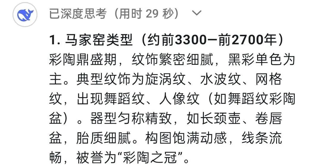 DeepSeek:馬家窯文化作為人類文明長(zhǎng)河中一顆璀璨的明珠,因最早發(fā)現(xiàn)于甘肅省臨洮縣馬家窯村而得名,它被認(rèn)為是仰韶文化向西發(fā)展的延續(xù),它展現(xiàn)了黃河上游先民的創(chuàng)造力,更是史前人類與自然對(duì)話、與社會(huì)共生的見(jiàn)證。