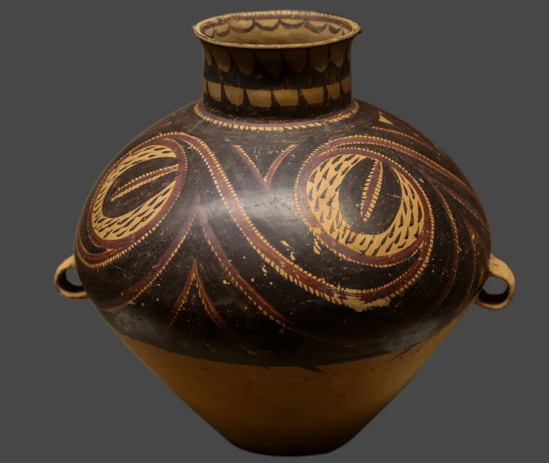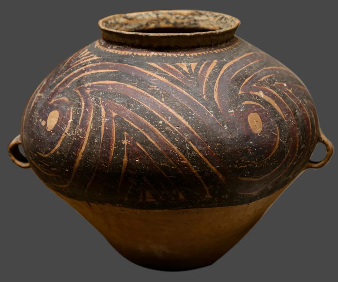 紋飾:以黑彩為主,常見(jiàn)漩渦紋、水波紋、平行線紋、網(wǎng)格紋、同心圓紋等,部分陶器上出現(xiàn)早期人像紋或舞蹈紋。