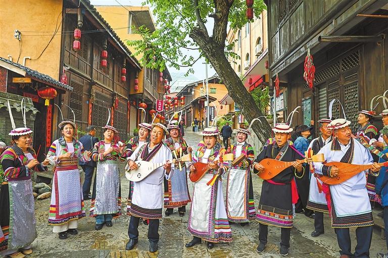 在文縣鐵樓藏族鄉(xiāng)草河壩村白馬山寨,土琵琶彈唱表演吸引游客駐足觀賞。新甘肅·甘肅日報(bào)記者 馮樂凱