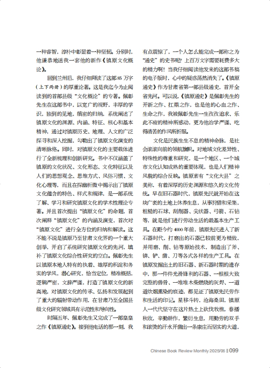 回到蘭州后,我仔細(xì)拜讀了這部85萬字(上下兩冊)的厚重論著。這是我迄今為止閱讀到的首部縣級“文化概論”的專著。佩彰先生在這部書中,以寬廣的視野,豐厚的學(xué)識,獨(dú)到的見地,縝密的歸納,系統(tǒng)闡述了鎮(zhèn)原文化的淵源、內(nèi)涵、特征、核心和基本精神,通過對鎮(zhèn)原歷史、地理、人文的廣泛探尋和深入挖掘,勾勒出了鎮(zhèn)原文化演變的清晰脈絡(luò)。同時(shí),對鎮(zhèn)原文化的主要載體進(jìn)行了全新梳理和創(chuàng)新研究。書中不僅涵蓋了鎮(zhèn)原的文化狀況、文化形態(tài)、文化特征以及人們的思想觀念、思維方式、風(fēng)俗習(xí)慣、文化心理等,而且在探幽析微中揭示出了鎮(zhèn)原文化蘊(yùn)含的特色、樣式和規(guī)律,是一部系統(tǒng)了解、學(xué)習(xí)和研究鎮(zhèn)原文化的學(xué)術(shù)性理論專著。并且首次提出“鎮(zhèn)原文化”的命題,首次闡釋“鎮(zhèn)原文化”的內(nèi)涵及演變,首次對“鎮(zhèn)原文化”進(jìn)行全方位的歸納和解讀。這不能不說是鎮(zhèn)原乃至甘肅文化界的一個(gè)重大創(chuàng)舉,開啟了系統(tǒng)研究鎮(zhèn)原文化的先河,填補(bǔ)了鎮(zhèn)原文化綜合性研究的空白。佩彰先生以鎮(zhèn)原本地人特有的執(zhí)著、雄厚的積淀和務(wù)實(shí)的學(xué)風(fēng),潛心研究,恰當(dāng)定位,精準(zhǔn)概括,邏輯嚴(yán)密,文辭嚴(yán)謹(jǐn),打造了鎮(zhèn)原文化的新高地,對鎮(zhèn)原文化的傳承、弘揚(yáng)和發(fā)展起到了重大的輻射帶動作用,在甘肅乃至全國縣級文化研究領(lǐng)域具有示范性和導(dǎo)向性。