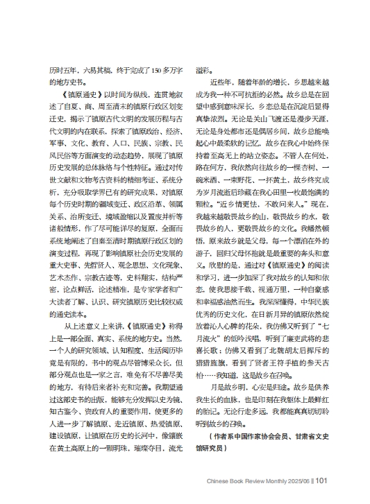從上述意義上來講,《鎮(zhèn)原通史》稱得上是一部全面、真實(shí)、系統(tǒng)的地方史。當(dāng)然,一個(gè)人的研究領(lǐng)域、認(rèn)知程度、生活閱歷畢竟是有限的,書中的觀點(diǎn)盡管博采眾長,但部分觀點(diǎn)也是一家之言,難免有不盡善盡美的地方,有待后來者補(bǔ)充和完善。我期望通過這部史書的出版,能夠充分發(fā)揮以史為鏡、知古鑒今、資政育人的重要作用,使更多的人進(jìn)一步了解鎮(zhèn)原、走近鎮(zhèn)原、熱愛鎮(zhèn)原、建設(shè)鎮(zhèn)原,讓鎮(zhèn)原在歷史的長河中,像鑲嵌在黃土高原上的一顆明珠,璀璨奪目,流光溢彩。