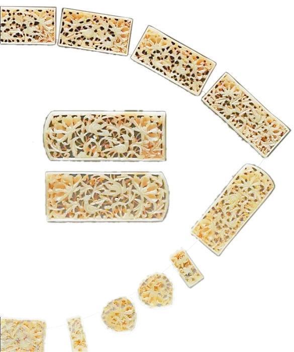 排方長5.1厘—7.6厘米、寬3.3厘米、厚0.7厘米,1955年蘭州市上西園明墓出土。青灰色和田玉鏤雕而成,包括三臺(tái)1、弼輔4、圓桃4、鉈尾2、排方7,均透雕牡丹花枝,邊緣有界欄。其中四塊較大的長條排方,雕飾最為精美,于繁花密葉間配置一對(duì)雉雞,構(gòu)圖繁縟,富于變化,顯示出工匠高超的技術(shù)造詣。