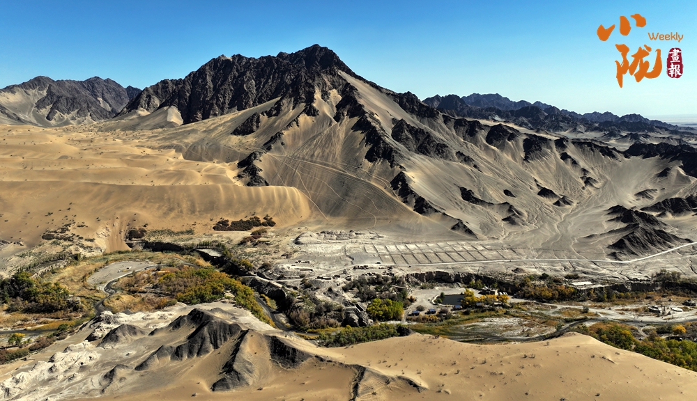 連綿起伏的沙丘如金色浪潮,環(huán)抱著一汪碧水,藍天白云倒映其中。金黃的胡楊在秋風中輕輕搖曳,宛如一群身著華麗服飾的衛(wèi)士,默默守護著這片沙漠中的綠洲。