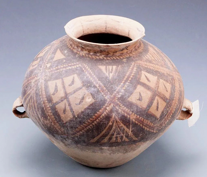 菱格紋是馬家窯文化半山類型彩陶的核心紋飾,由連續(xù)排列的菱形格構(gòu)成,常見(jiàn)于壺、罐等器物的上腹部。該紋飾流行于公元前2650-2350年的馬家窯文化中期,典型器型如甘肅省廣河縣半山遺址出土的菱格紋彩陶雙耳罐。早期以大面積菱格為主體,晚期演變?yōu)樘畛渚W(wǎng)格或涂黑的輔助紋飾,至馬廠時(shí)期發(fā)展為四大圓圈紋內(nèi)裝飾。