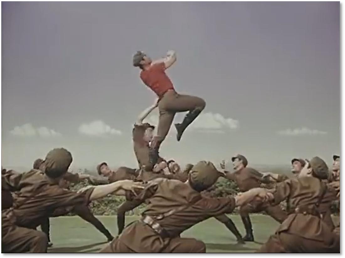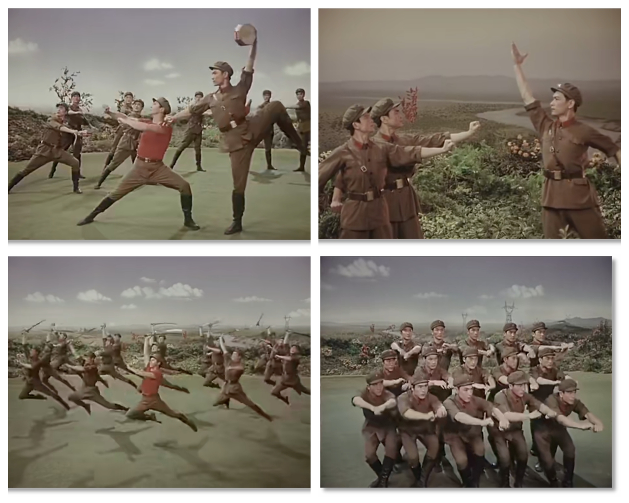 有趣的是,膠片并非被動(dòng)記錄,它悄然行使著選擇的權(quán)力——它決定了后世的人們將以何種視角、何種景別來銘記《戰(zhàn)馬嘶鳴》。在鏡頭中定格下來的膠片拷貝,就此定義了經(jīng)典的面貌。從舞臺(tái)到膠片,作品完成了一次關(guān)鍵的媒介化轉(zhuǎn)身,從一場限時(shí)演出,變身為一個(gè)時(shí)代的文化符號(hào)。這使軍藝精神在沒有數(shù)字媒體的時(shí)代,得以廣泛流傳和保存。