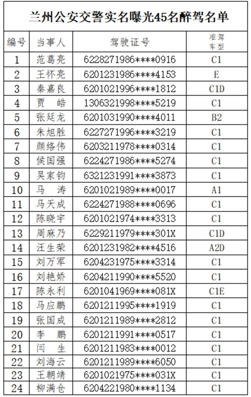 今年以來,蘭州市共查處酒醉駕1249起。其中,飲酒駕駛721起,醉酒駕駛528起。6月以來,又查處酒醉駕案件50起。然而,還是有人心存僥幸,甚至酒醉駕駕車引發(fā)道路交通事故。為進(jìn)一步加強交通安全宣傳和警示教育,強化社會監(jiān)督,蘭州公安將近期查獲的45名醉酒駕駛機動車人員予以曝光,名單如下: