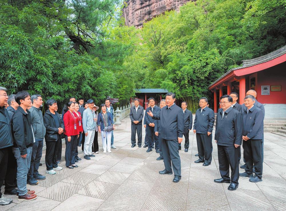 隨后,習(xí)近平來到麥積山石窟,沿著棧道仔細察看距今1600多年的洞窟和雕塑、壁畫,同保護修復(fù)工作人員親切交流。習(xí)近平說,我國四大石窟是中華文明的瑰寶,都具有重要的歷史價值、文化價值。他希望文物工作者賡續(xù)“莫高精神”,潛心為國護寶,為傳承創(chuàng)新中華優(yōu)秀傳統(tǒng)文化、增強中華文化影響力作出更大貢獻。