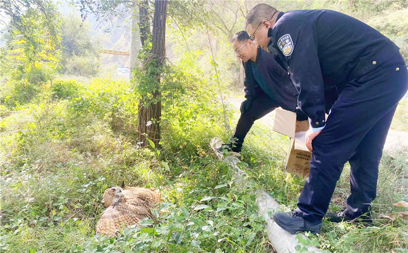 到達現(xiàn)場后,經(jīng)確認(rèn)該野生物種屬于國家二級保護動物、雕鸮(貓頭鷹)。通過現(xiàn)場檢查,該貓頭鷹身體狀況良好,無外傷,活動情況良好,具有野外生存能力,符合放生條件。于當(dāng)日,民警將其帶至野外放歸大自然。