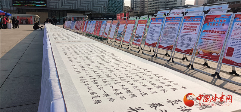 活動(dòng)現(xiàn)場(chǎng),省委宣傳部、省委政法委、省法院、省檢察院等20余家單位結(jié)合行業(yè)實(shí)際,宣傳憲法,普及法律知識(shí),為群眾提供法律咨詢(xún)。為了豐富普法載體,讓群眾在互動(dòng)參與中學(xué)習(xí)法律知識(shí),活動(dòng)展出了由定西市通渭縣司法局聯(lián)合書(shū)法家、師生群體、法官、檢察官、公安民警等各行各業(yè)工作人員創(chuàng)作的百米《書(shū)·法》長(zhǎng)卷,鐫刻法治精神,書(shū)寫(xiě)法律法規(guī)?,F(xiàn)場(chǎng)還表演了精彩的文藝節(jié)目。