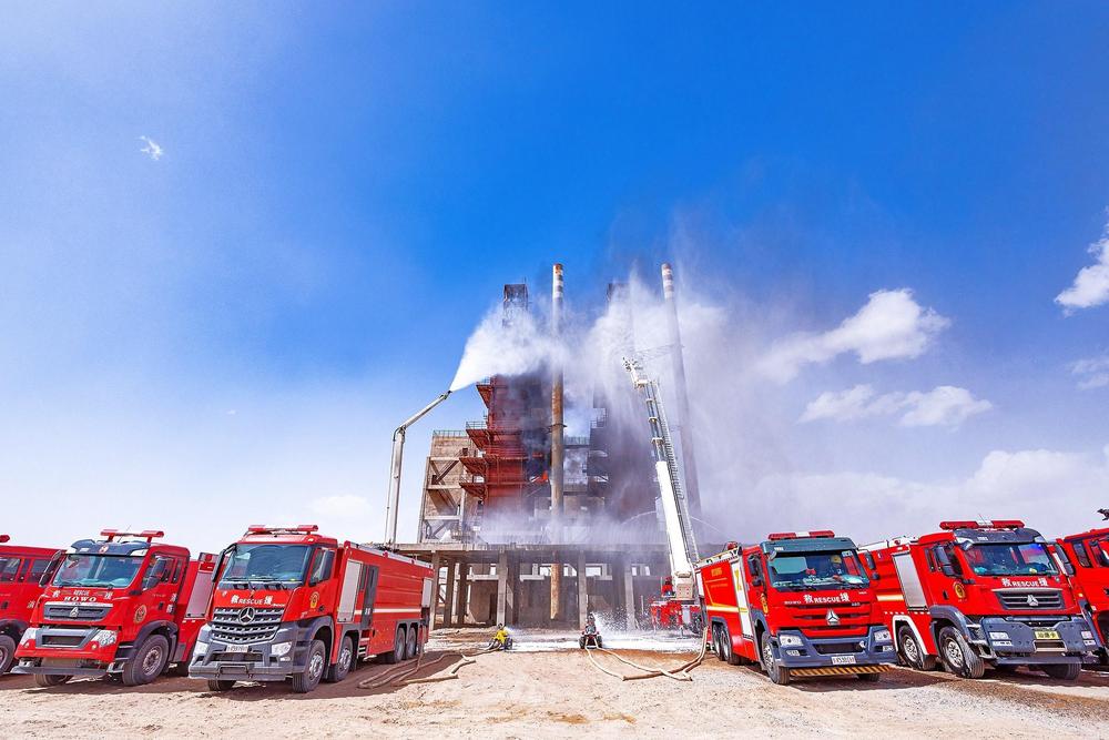 在“次生災(zāi)害滅火救援”科目現(xiàn)場(chǎng),化工園區(qū)內(nèi)的熊熊烈焰映紅了半邊天。消防員身著隔熱服操控滅火機(jī)器人抵近火源,高噴車(chē)噴射出的泡沫如瀑布般覆蓋燃燒裝置,移動(dòng)炮陣列織就立體火網(wǎng)。從突破火線到追殲火頭,從清理余火到看守火場(chǎng),救援人員輪替堅(jiān)守在一線,成功阻止火勢(shì)的蔓延。