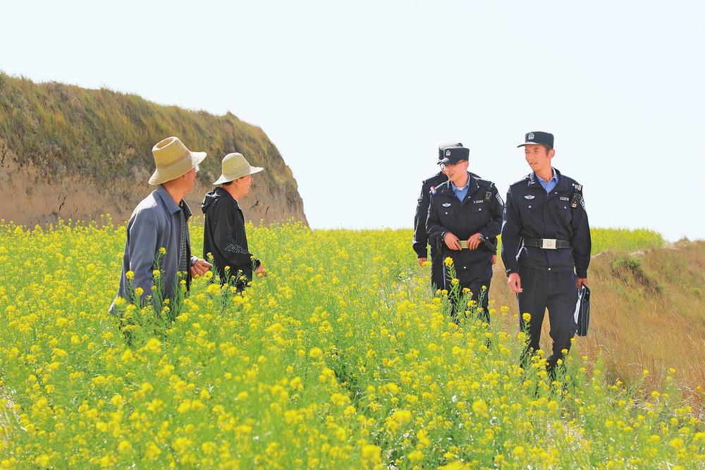 民警田間地頭走訪群眾。5月15日,定西市公安局安定分局組織民輔警開展社情民意大走訪,面對(duì)面傾聽群眾呼聲、征求群眾意見,解決實(shí)際困難,宣講安全知識(shí),不斷增強(qiáng)人民群眾的獲得感、幸福感、安全感?! ⌒赂拭C·甘肅法治報(bào)通訊員楊永剛攝