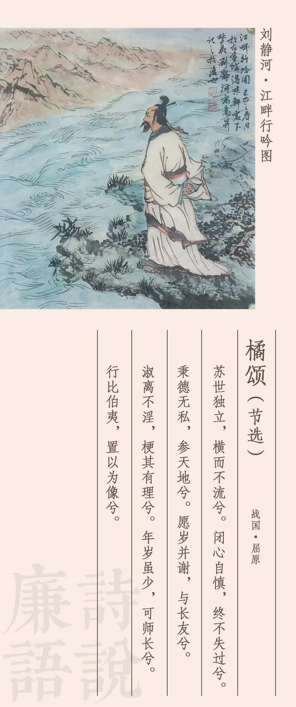 《橘頌》被譽為中國最早的詠物詩。據(jù)考證,屈原在流放之初,苦悶憤激,看到南國的橘樹,心有所觸,將橘樹人格化,賦予其君子仁人的品格,寫下了這首詩。詩分兩部分,前半部分寫實,刻畫了橘樹的生長習(xí)性和枝葉花果,后半部分抒情議論,托物言志,橘人合一,情景交融。這里節(jié)選了后半部分,大意如下:清醒立世啊不隨波逐流,小心謹慎啊過失從不留,沒有私欲啊與天地比儔,我與你同生死啊永結(jié)為好友,你形象美好啊耿直作一流,你風(fēng)華正茂啊堪為好師長,你高潔比伯夷啊榜樣最優(yōu)秀。