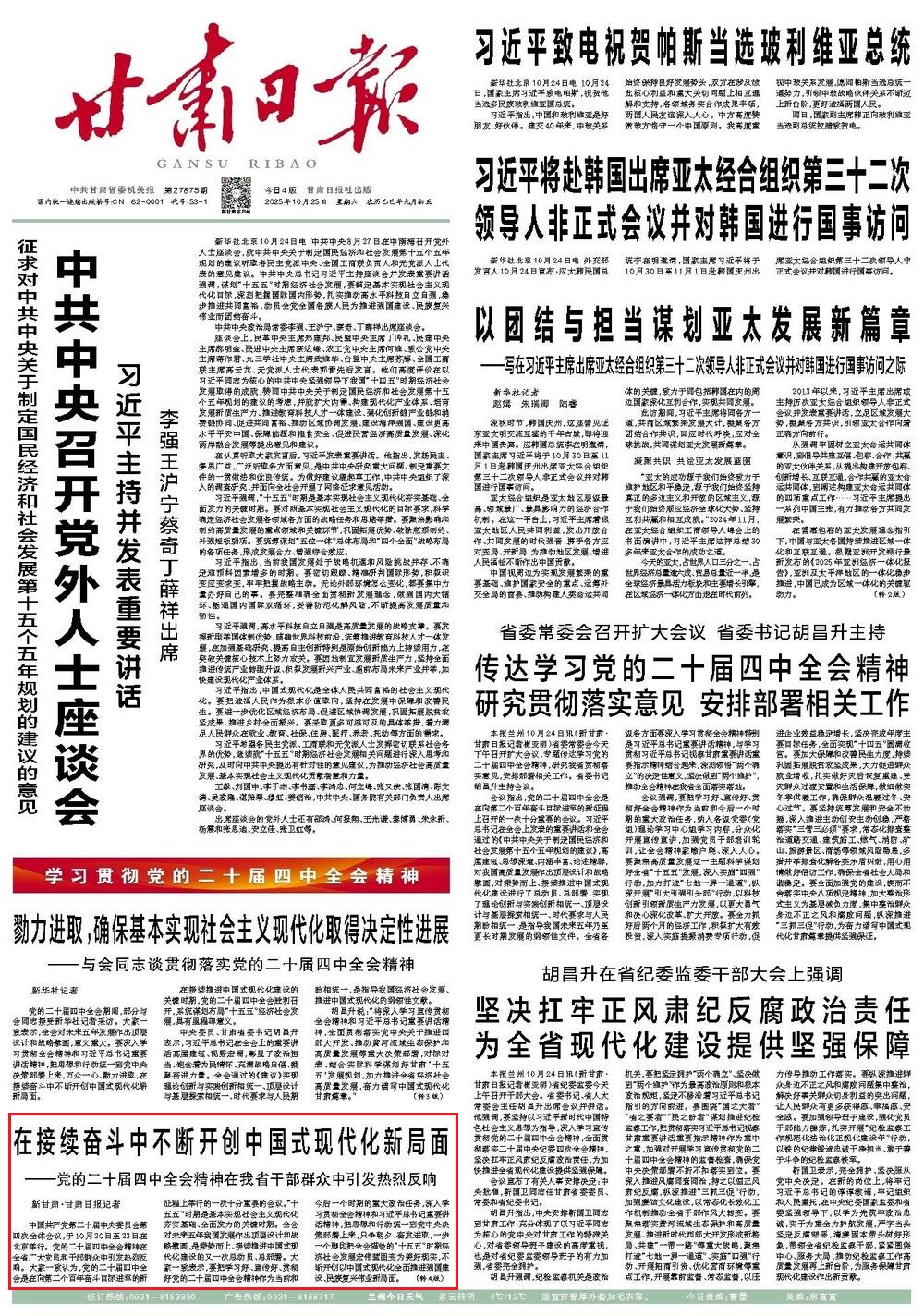 中國共產(chǎn)黨第二十屆中央委員會第四次全體會議,于10月20日至23日在北京舉行。黨的二十屆四中全會精神在全省廣大黨員和干部群眾中引發(fā)熱烈反響。大家一致認(rèn)為,黨的二十屆四中全會是在向第二個百年奮斗目標(biāo)進(jìn)軍的新征程上舉行的一次十分重要的會議。“十五五”時期是基本實現(xiàn)社會主義現(xiàn)代化夯實基礎(chǔ)、全面發(fā)力的關(guān)鍵時期。全會對未來五年我國發(fā)展作出頂層設(shè)計和戰(zhàn)略擘畫,是乘勢而上、接續(xù)推進(jìn)中國式現(xiàn)代化建設(shè)的又一次總動員、總部署。大家一致表示,要把學(xué)習(xí)好、宣傳好、貫徹好黨的二十屆四中全會精神作為當(dāng)前和今后一個時期的重大政治任務(wù),深入學(xué)習(xí)貫徹全會精神和習(xí)近平總書記重要講話精神,把思想和行動統(tǒng)一到黨中央決策部署上來,只爭朝夕、奮發(fā)進(jìn)取,一步一個腳印把全會描繪的“十五五”時期經(jīng)濟(jì)社會發(fā)展宏偉藍(lán)圖變?yōu)槊篮矛F(xiàn)實,不斷開創(chuàng)以中國式現(xiàn)代化全面推進(jìn)強國建設(shè)、民族復(fù)興偉業(yè)新局面。