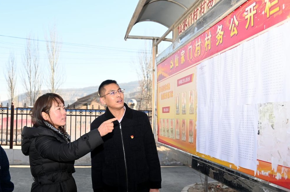 隴西縣紀(jì)委監(jiān)委推動(dòng)加大農(nóng)村集體“三資”公示公開(kāi)力度,督促各村(社區(qū))綜合運(yùn)用管理平臺(tái)、村務(wù)公開(kāi)欄等,及時(shí)公開(kāi)“三資”管理使用情況。圖為近日,該縣文峰鎮(zhèn)紀(jì)檢監(jiān)察干部在仙家門村查看公開(kāi)公示情況。崔翔龍 攝