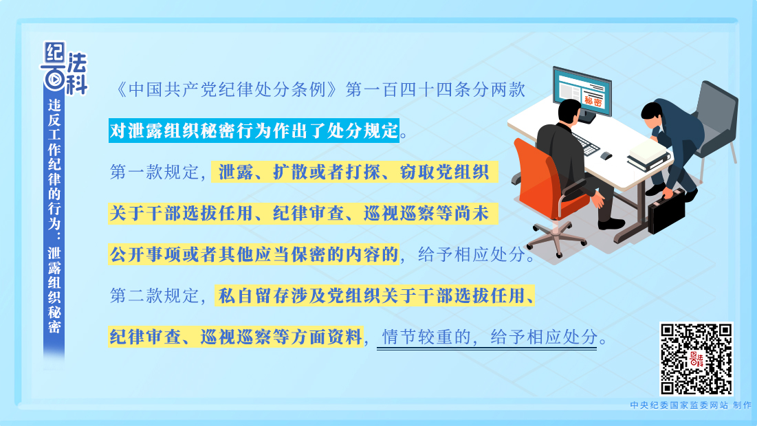 《中國(guó)共產(chǎn)黨紀(jì)律處分條例》第一百四十四條分兩款對(duì)泄露組織秘密行為作出了處分規(guī)定。第一款規(guī)定,泄露、擴(kuò)散或者打探、竊取黨組織關(guān)于干部選拔任用、紀(jì)律審查、巡視巡察等尚未公開事項(xiàng)或者其他應(yīng)當(dāng)保密的內(nèi)容的,給予警告或者嚴(yán)重警告處分;情節(jié)較重的,給予撤銷黨內(nèi)職務(wù)或者留黨察看處分;情節(jié)嚴(yán)重的,給予開除黨籍處分。第二款規(guī)定,私自留存涉及黨組織關(guān)于干部選拔任用、紀(jì)律審查、巡視巡察等方面資料,情節(jié)較重的,給予警告或者嚴(yán)重警告處分;情節(jié)嚴(yán)重的,給予撤銷黨內(nèi)職務(wù)處分。