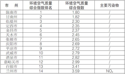 9月份,全省14個城市環(huán)境空氣質(zhì)量綜合排名由好到差分別為:隴南、甘南、臨夏、定西、金昌、天水、張掖、慶陽、平?jīng)觥⑽渫⒕迫?、嘉峪關(guān)、白銀、蘭州。
