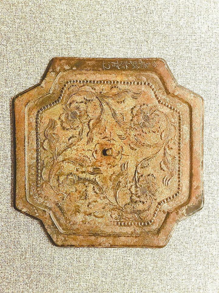 平?jīng)鍪胁┪镳^藏,唐代,八瓣菱花形,內(nèi)切圓形,圓鈕。上下左右交隔對(duì)稱分布四只鸞鳥、四枝二葉二苞折枝花。