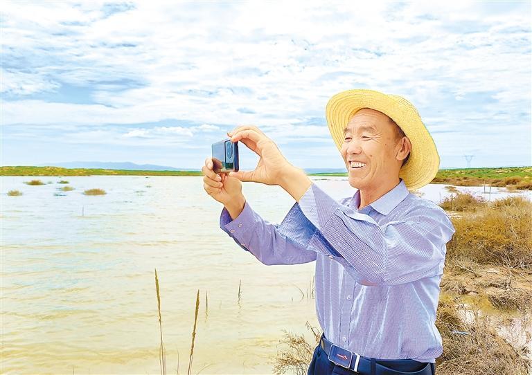 郭萬(wàn)剛格外珍惜這一灘湖水,他沿著水岸走了很久,還不時(shí)地用手機(jī)拍照,他認(rèn)為這是大自然對(duì)古浪持續(xù)開展生態(tài)建設(shè)的回報(bào)。“我今年70歲了,這是我第一次在這片沙漠里見到湖泊,給它取名‘紅沙湖’,希望它像沙漠里的紅柳一樣永遠(yuǎn)充滿生機(jī),不要干涸。”郭萬(wàn)剛說。