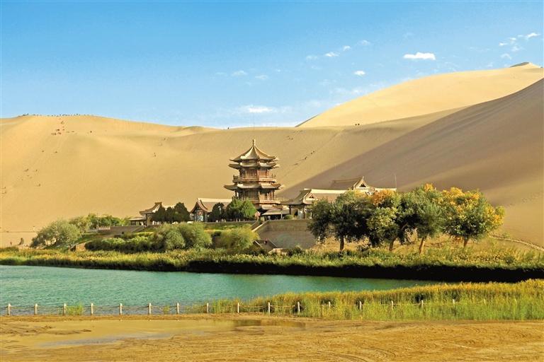 這是10月4日拍攝的甘肅省敦煌市鳴沙山月牙泉景區(qū)。金秋時(shí)節(jié),神州大地秋景如畫,盡顯大美中國山河錦繡。 新華社照片