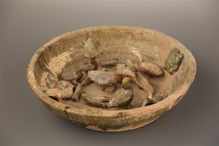 綠釉陶陂池高15厘米,口32厘米,底16厘米,為蘭州市博物館館藏三級文物。陶陂池內(nèi)有形象生動的鴨、鵝、龜、青蛙等造型,代表墓主人生前擁有這樣一份家產(chǎn)。陂池,指在自然坡地筑堤蓄水澆灌農(nóng)田的池塘、澤沼。我國興修陂池的歷史很早,傳說夏禹治水時,曾從事“陂九澤”的工程。利用地勢蓄水灌溉,在古代較為普遍,尤其在漢代時陂池工程得到較大發(fā)展。陂池養(yǎng)魚、家禽、種藕、種菱角、養(yǎng)龜,不僅可提高農(nóng)民的經(jīng)濟收入,豐富人們的食物來源,還可以起到美化環(huán)境、凈化水質(zhì)的作用,青蛙、田螺自由生存,起到平衡自然生態(tài)的作用。