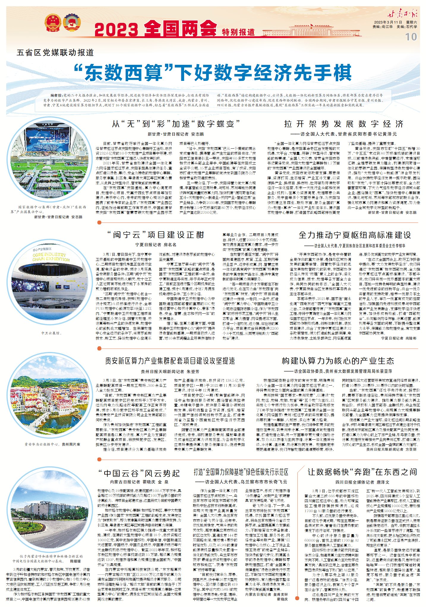 編者按:黨的二十大報(bào)告提出,加快發(fā)展數(shù)字經(jīng)濟(jì),促進(jìn)數(shù)字經(jīng)濟(jì)和實(shí)體經(jīng)濟(jì)深度融合,打造具有國(guó)際競(jìng)爭(zhēng)力的數(shù)字產(chǎn)業(yè)集群。2022年2月,國(guó)家相關(guān)部委在京津冀、長(zhǎng)三角、粵港澳大灣區(qū)、成渝、內(nèi)蒙古、貴州、甘肅、寧夏8地建設(shè)國(guó)家算力樞紐節(jié)點(diǎn),規(guī)劃了10個(gè)國(guó)家數(shù)據(jù)中心集群,標(biāo)志著“東數(shù)西算”工程正式全面啟動(dòng)。“東數(shù)西算”通過(guò)構(gòu)建數(shù)據(jù)中心、云計(jì)算、大數(shù)據(jù)一體化的新型算力網(wǎng)絡(luò)體系,將東部算力需求有序引導(dǎo)到西部,優(yōu)化數(shù)據(jù)中心建設(shè)布局、促進(jìn)東西部協(xié)同聯(lián)動(dòng)。全國(guó)兩會(huì)期間,甘肅日?qǐng)?bào)聯(lián)合寧夏日?qǐng)?bào)、貴州日?qǐng)?bào)、四川日?qǐng)?bào)、內(nèi)蒙古日?qǐng)?bào)開(kāi)展聯(lián)動(dòng)報(bào)道,展現(xiàn)“東數(shù)西算”工程實(shí)施一年來(lái)的最新探索和實(shí)踐成果。