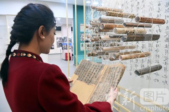 3月14日,敦煌研究院敦煌文獻(xiàn)研究所所長趙曉星接受中新社記者專訪介紹稱,全彩印《敦煌文獻(xiàn)全集》出版工作已正式啟動,該叢書采用全彩印的方式刊布敦煌文獻(xiàn),實現(xiàn)敦煌文獻(xiàn)在線下圖錄中的高清還原。敦煌文獻(xiàn),又稱敦煌遺書,是指1900年在甘肅敦煌莫高窟藏經(jīng)洞發(fā)現(xiàn)的公元4世紀(jì)至11世紀(jì)的寫本、印本和拓片等文獻(xiàn)。據(jù)最新統(tǒng)計顯示,其總數(shù)近7萬件。目前這些文獻(xiàn)分藏于中、英、法、俄、日等國的數(shù)十家收藏機(jī)構(gòu),一直缺乏完整的聯(lián)合目錄。圖為3月3日,工作人員在敦煌藝術(shù)館卷軸墻前閱覽敦煌遺書影印品。 中新社記者 九美旦增 攝