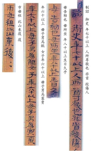 1981年出土于武威磨嘴子漢墓中的“王杖詔書令冊”簡則是關于古代敬老養(yǎng)老制度的法律法規(guī),堪稱古代“老年人權益保護法”。原簡背面有編號第一至第廿七,共27簡,但第15簡已缺失,余26簡首尾俱全。正面有556個字,雖歷經千年,上面墨書的漢隸依然清晰可見。簡文內容豐富,記載明確,既有撫恤鰥寡孤獨廢疾之人的具體做法,又有敬老養(yǎng)老高年賜王杖的明確規(guī)定。