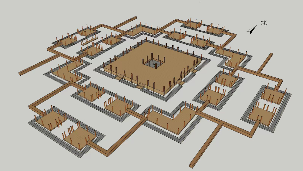 四角坪遺址考古隊(duì)領(lǐng)隊(duì)、甘肅省文物考古研究所副研究館員侯紅偉介紹,四角坪遺址已發(fā)掘部分主要由中部大型方形夯土臺基、四周的附屬建筑以及四角曲尺形附屬建筑組成,整個(gè)建筑群層級分明、秩序井然。整體呈現(xiàn)出以中部大型夯土臺基為中心的對稱格局??脊湃藛T通過解剖土層發(fā)現(xiàn),整個(gè)臺基由34層夯土夯筑而成,每層厚7至8厘米。