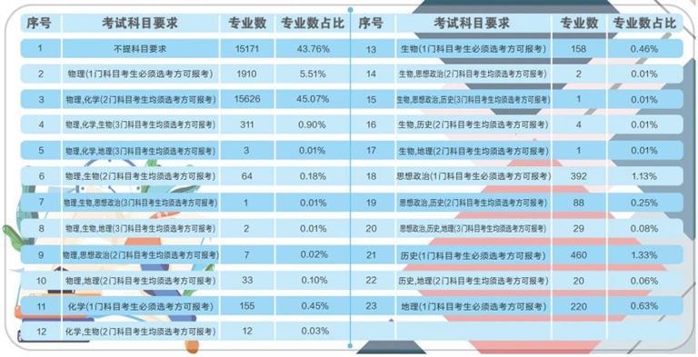 據(jù)了解,根據(jù)《甘肅省深化高等學??荚囌猩C合改革實施方案》要求,從 2021年秋季入學的普通高中一年級學生開始,實行基于統(tǒng)一高考和高中學業(yè)水平考試成績、參考綜合素質(zhì)評價的高??荚囌猩J?。到2024年,基本形成分類考試、綜合評價、多元錄取的高??荚囌猩贫龋∪龠M公平、科學選才、監(jiān)督有力的高??荚囌猩w制機制。此次在我省報送選考科目要求的高校專業(yè)共計64092條,其中本科專業(yè)34670條。專業(yè)選考科目要求共有23種組合,其中不提科目要求的本科專業(yè)數(shù)量占本科專業(yè)總數(shù)的43.76%,含物理科目的占比為51.79%,含化學科目的占比為46.46%,含歷史科目的占比為1.74%,含“物理+化學”科目的占比為45.98%。