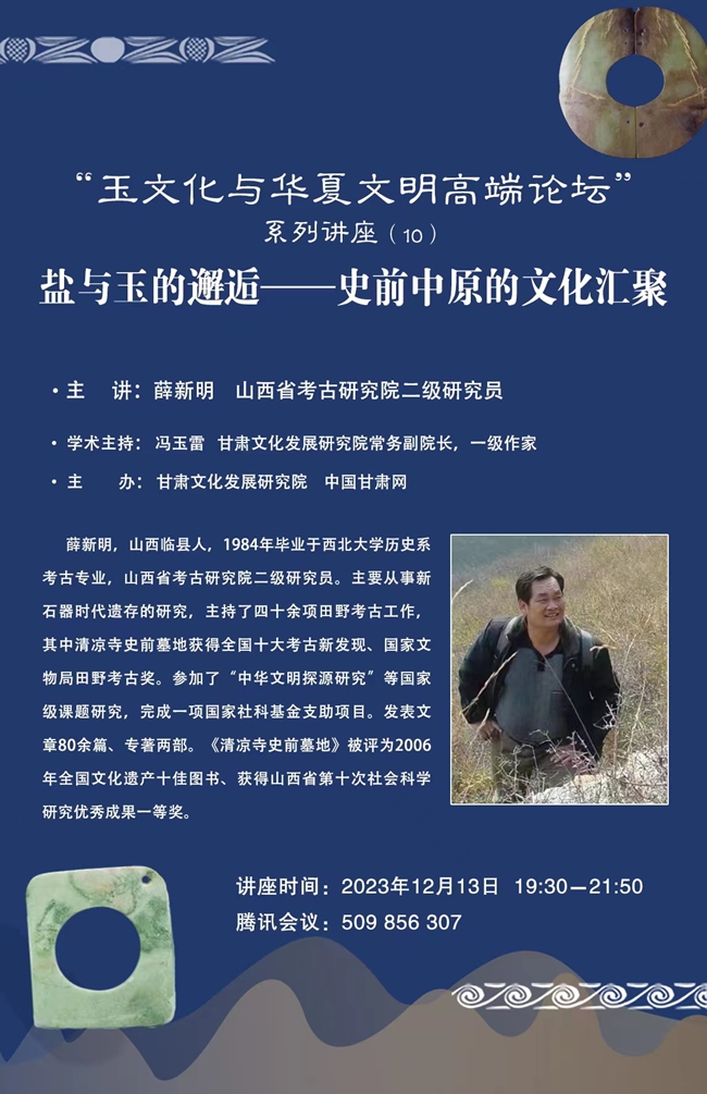 12月13日晚,山西省考古研究院二級(jí)研究員薛新明在線做了題為《玉器所見(jiàn)齊家文化時(shí)期甘青地區(qū)與關(guān)中地區(qū)的交流互動(dòng)》的學(xué)術(shù)報(bào)告。這是甘肅文化發(fā)展研究院主辦的“玉文化與華夏文明高端論壇”系列講作活動(dòng)第10講,也是今年的壓軸之講。