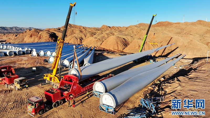 隆冬季節(jié),在甘肅省張掖市甘州區(qū)平山湖風(fēng)電基地國(guó)家電投10萬(wàn)千瓦風(fēng)電項(xiàng)目建設(shè)工地,工人正在進(jìn)行風(fēng)機(jī)葉片吊裝作業(yè)。