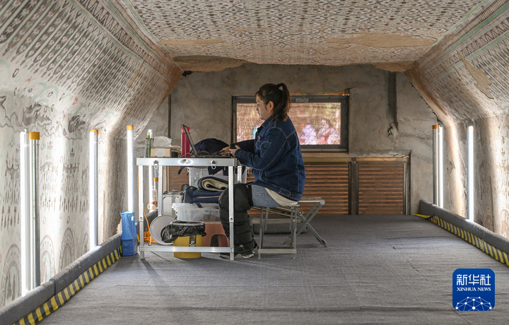 8月3日,在敦煌莫高窟正在保護修繕的第55窟內(nèi),一位文保工作者對采集的數(shù)據(jù)進行整理。新華每日電訊記者 李賀 攝