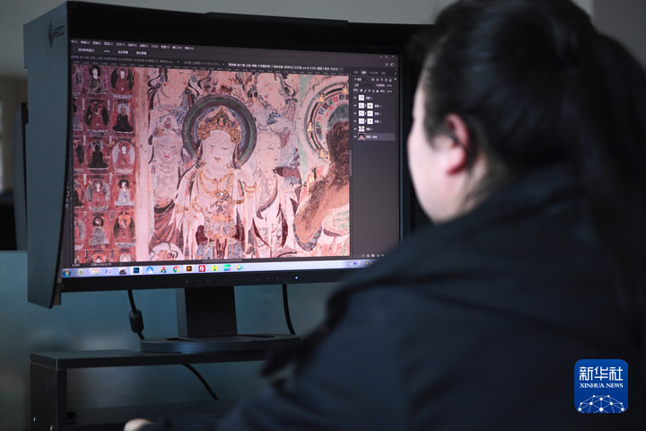4月25日,敦煌研究院文物數(shù)字化保護團隊圖像處理人員年海麗在拼接壁畫圖像。新華每日電訊記者 陳斌 攝