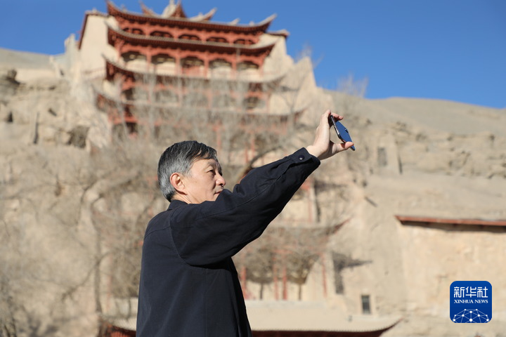 2022年2月23日 敦煌研究院院長蘇伯民正在用手機進行“數(shù)字敦煌”體驗。新華每日電訊記者 張睿 攝