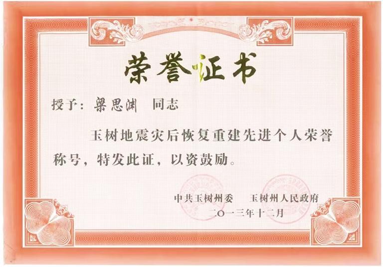 他一直這樣嚴(yán)于要求自己。因在格薩爾王賓館地震遺址維修保護(hù)項(xiàng)目中作出突出貢獻(xiàn),梁思淵被玉樹州委、州政府評為“玉樹地震災(zāi)后恢復(fù)重建先進(jìn)個人”。疫情期間,他主動請纓,參與雁南路街道防疫物資運(yùn)輸保障任務(wù),轉(zhuǎn)運(yùn)物資總計150多趟次。