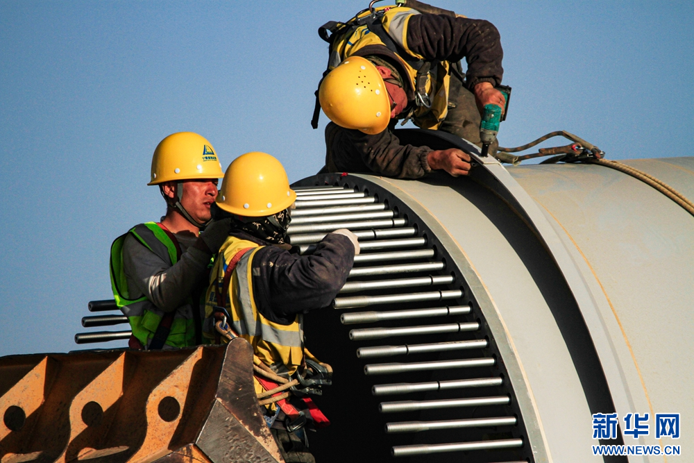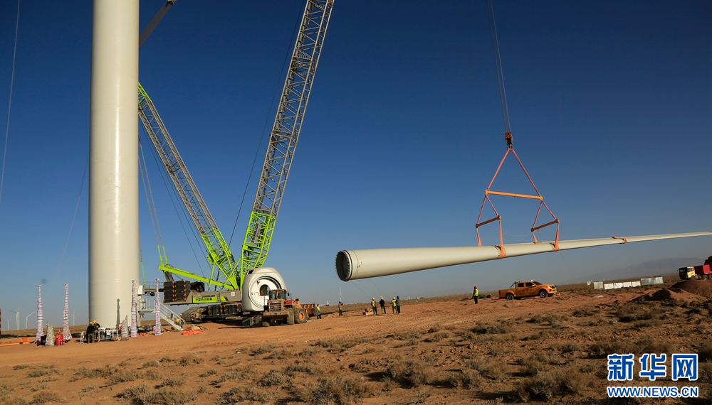 近日,在甘肅省張掖市甘州區(qū)平山湖20千瓦風(fēng)電施工現(xiàn)場(chǎng),工人們緊張有序地進(jìn)行風(fēng)電設(shè)備安裝工作。新華網(wǎng)發(fā)(陳禮 攝)