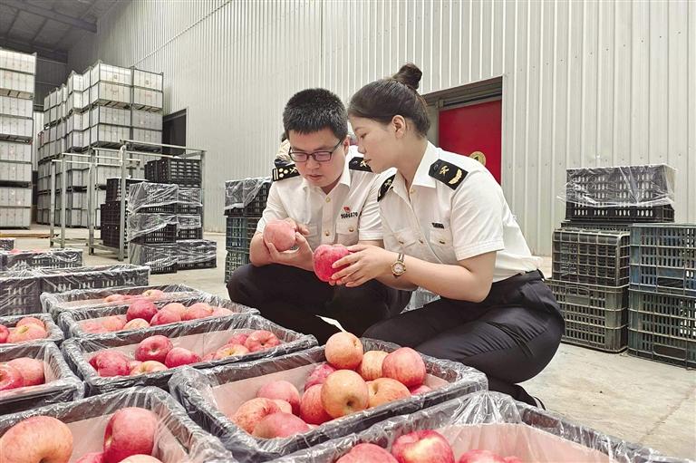 圖為海關(guān)關(guān)員檢查出口水果。據(jù)悉,上半年甘肅省出口水果價(jià)值4.56億元,同比增長42.7%。