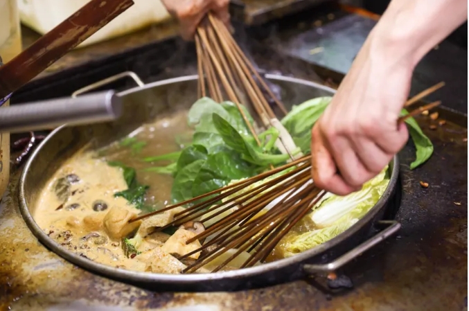 湯鍋翻滾,竹簽成把