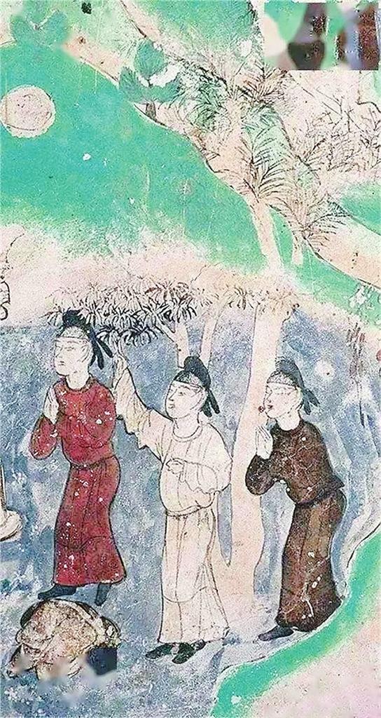 我想,這也是古代敦煌女子在中秋拜月時(shí)最真摯的愿望:覓得佳偶、擇得良婿;家庭和睦、永不分離!值得注意的是在敦煌有關(guān)相戀男女主題壁畫(huà)中總是表現(xiàn)出“有情人必成眷屬”的信念。如在莫高窟第321窟壁畫(huà)中有一幅“青年男女圖”、在莫高窟第85窟壁畫(huà)中有一幅“樹(shù)下彈箏圖”、在榆林窟第38窟壁畫(huà)中有一幅“同入青廬圖”等。這些壁畫(huà)有著很多相似之處:一是畫(huà)面中的男女多穿情侶衫。女性或上衣或下裙總有一個(gè)和男性的袍服使用的顏色相同;二是畫(huà)面中的情感都是大團(tuán)圓的美滿結(jié)局;三是畫(huà)面中男女的情緒都被刻繪得欣喜若狂、堅(jiān)定執(zhí)著。我想當(dāng)年這些表達(dá)中秋意象的畫(huà)匠們一定是為了不辜負(fù)這澄澈圓滿的明月吧!