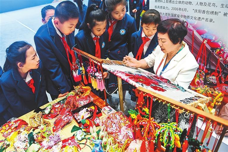 9月22日,慶陽(yáng)香包刺繡展位非遺傳承人給孩子們展示刺繡技藝。新甘肅·甘肅日?qǐng)?bào)記者丁凱