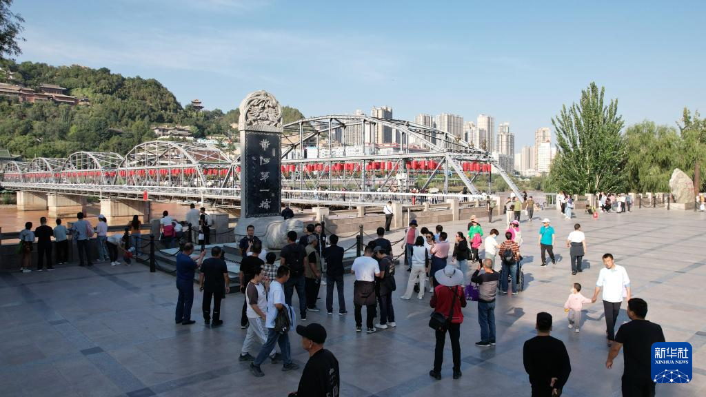 游客在蘭州地標(biāo)——中山橋參觀游覽(9月23日攝,無(wú)人機(jī)照片)。新華社記者陳斌攝